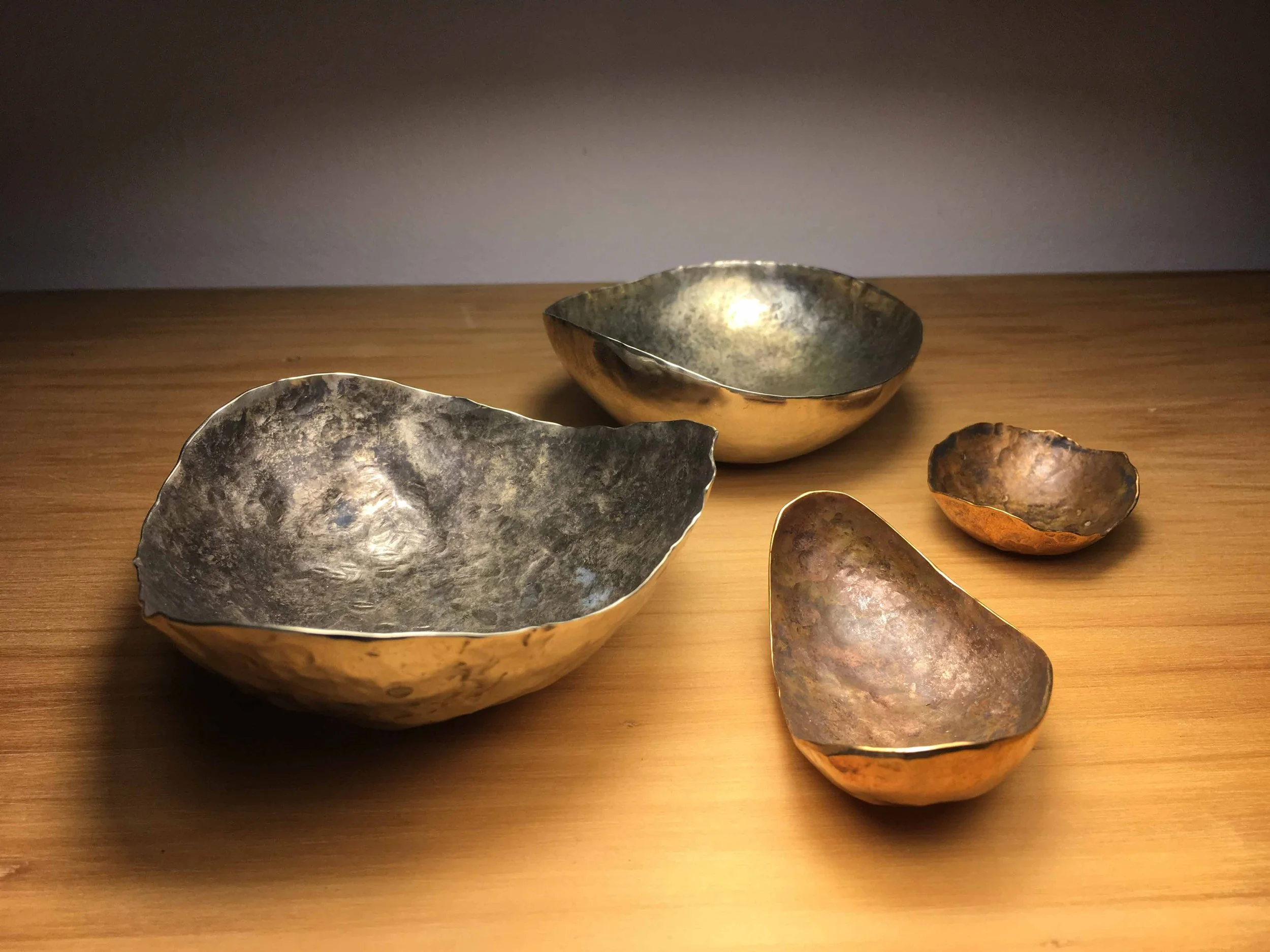Trabajo el bronce, el cobre y la alpaca mediante forja en frío. Mi experiencia en joyería y luminarias me permitió profundizar en el uso del repujado manual, que realizo sobre matrices talladas en maderas duras. A través del martelado, genero patrones repetitivos y texturas que aportan a las superficies una riqueza táctil y visual singular.